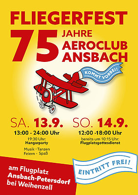 Traditionell veranstaltet der Aero-Club Ansbach am zweiten Septemberwochenende sein Fliegerfest (genauer Termin für dieses Jahr siehe unter Verein - Vereinskalender). Von Samstagmittag bis Sonntagabend wird die große Vielfalt der Modell-, Segel-, Ultraleicht- und Motorflugzeuge gezeigt.
